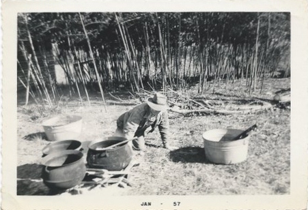 This is one of my all time favorite photographs. My grandpa is preparing to butcher a hog and boiling water is part of the process. The scalding water is used to remove the fine hair of a hog. The pigs not only provided food for grandpa and his family in the way of ham, sausage and alike, the ones that sold at market provided money in the cookie jar to be used for other things.